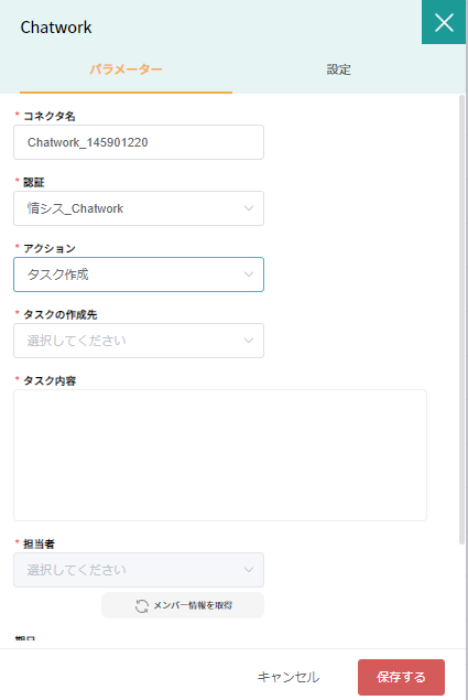 詳しくは以下のサイトをご参照ください。https://help.jenka.jp/portal/ja/kb/articles/chatwork#Chatwork